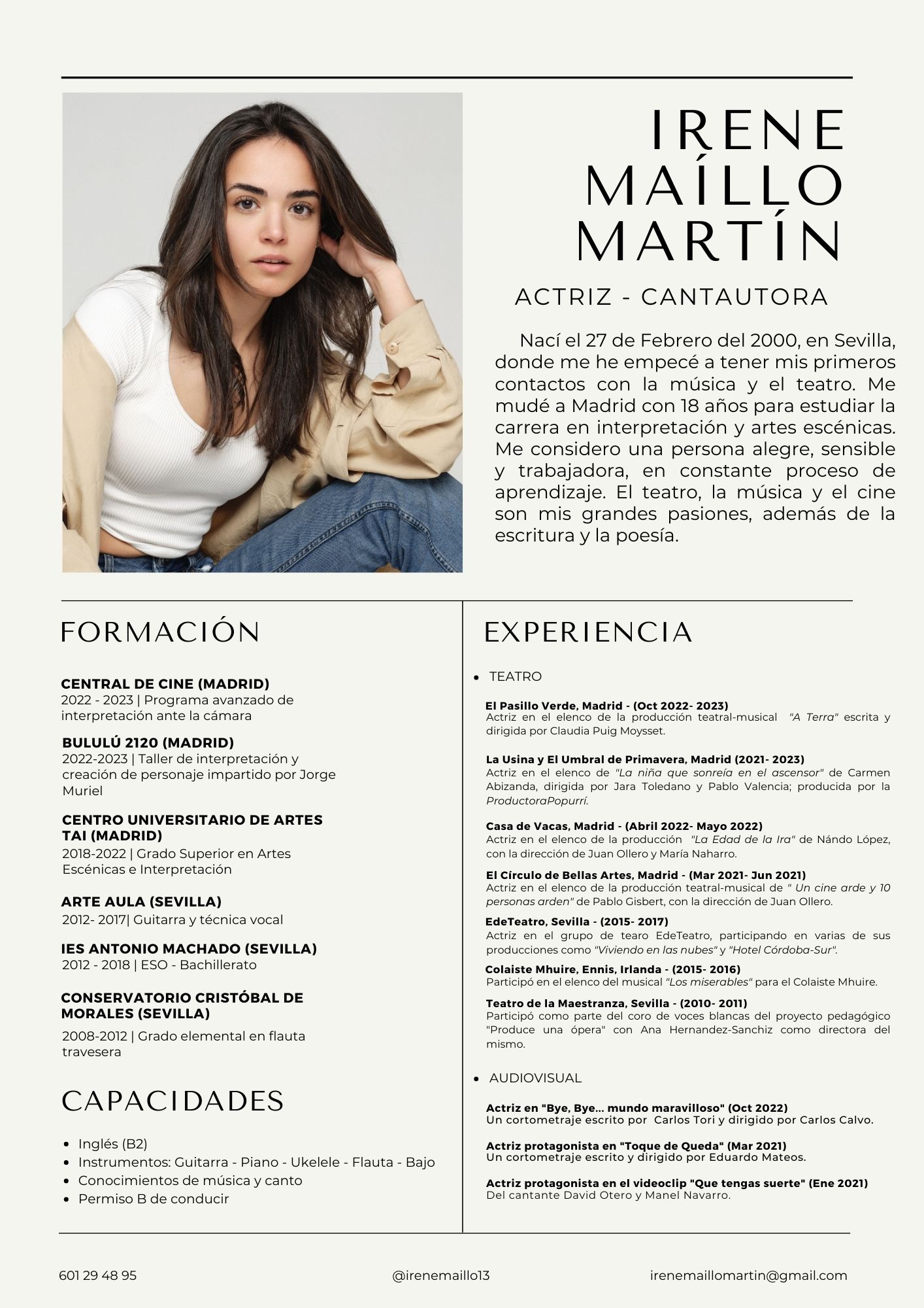 Soy una persona muy responsable, trabajadora y resolutiva. Creo que mi punto fuerte es la energía que trato de llevar a todos los lugares a donde voy, ya que me gusta mucho compartir y aprender de la gente que me rodea. El sentimentalismo y la empatía son rasgos de personalidad que siempre me han acompañado y de los que me siento muy agradecía a día de hoy. Es por eso que el teatro, el cine y la música me hacen tan feliz, ya que, aparte de reconocer estas habilidades personales en ellos, me ayudan a entender de forma más profunda este mundo que nos rodea.